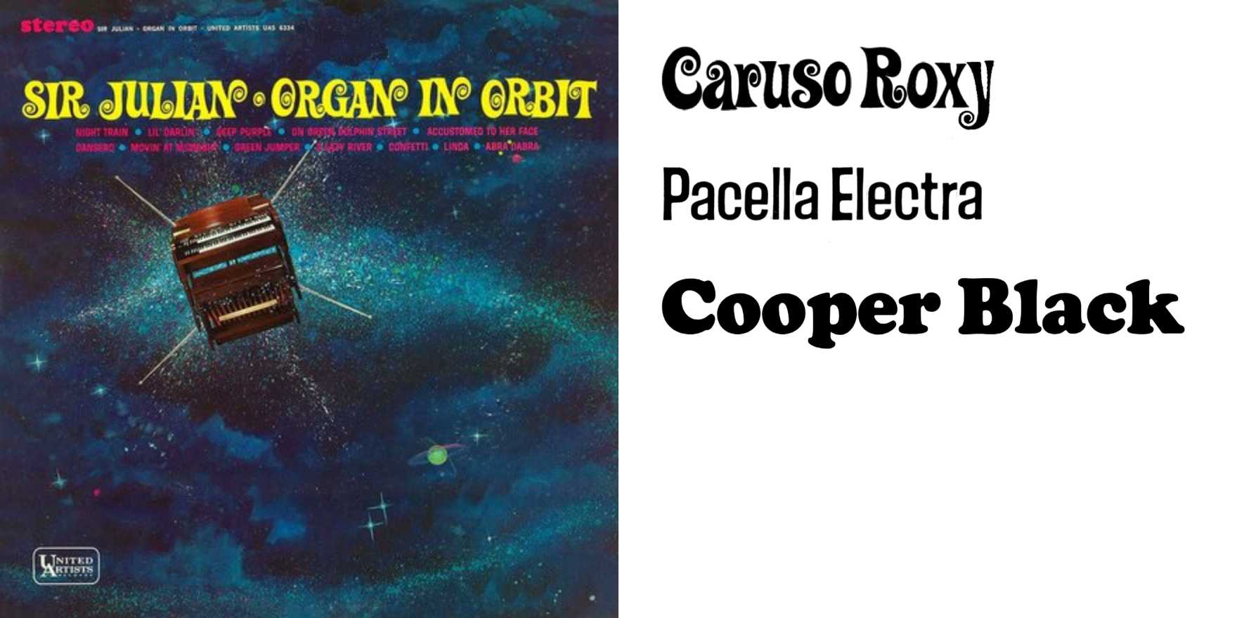 Caruso Roxy in yellow caps and with lots of its swirling glyphs for Organ in Orbit, a 1965 album by jazz space-age organist Julius Goldberg (1915–1977), better known as Sir Julian Gould, or just Sir … [+255 chars]
