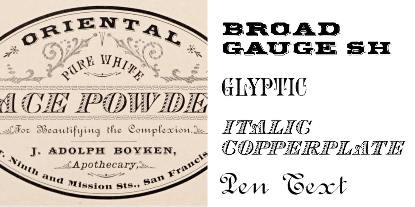Contributed by Stephen ColesSource: archive.org License: All Rights Reserved. McNeil Bros. was a San Jose printer specializing in labels. Their 1885 catalog, Specimens of Druggist Labels…, is an explosion of eccentric type and ornament in fancy frames, offe…